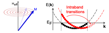 (图片说明:左图,磁阻尼示意图;右图,带内跃迁示意图。能带的平衡占据状态(黑色)随着磁矩进动偏离平衡态(红色),直至带内跃迁使其再次恢复平衡。来源:Chen et al.)
