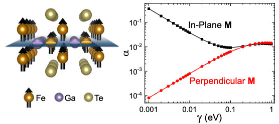(图片说明:左图,单层 Fe₃GaTe₂ 的原子结构。铁原子上的磁矩用黑色箭头表示。层中间的蓝色平面标识出晶格结构的镜像对称性。右图,单层 Fe₃GaTe₂ 在垂直(红色)和面内(黑色)磁矩方向下,吉尔伯特阻尼随电子散射率变化的关系。来源:Chen et al.)